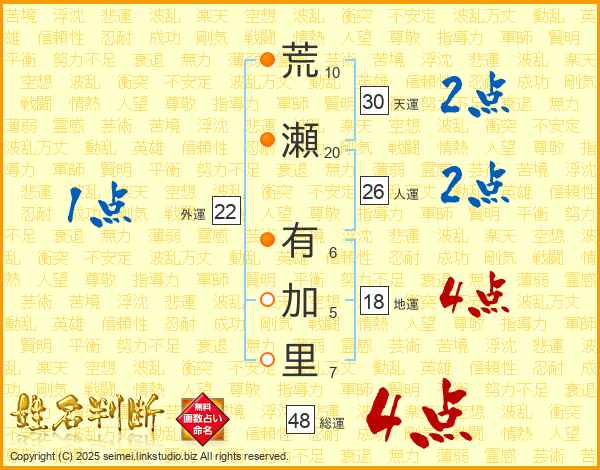 荒(10画)瀬(20画)  有(6画)加(5画)里(7画)