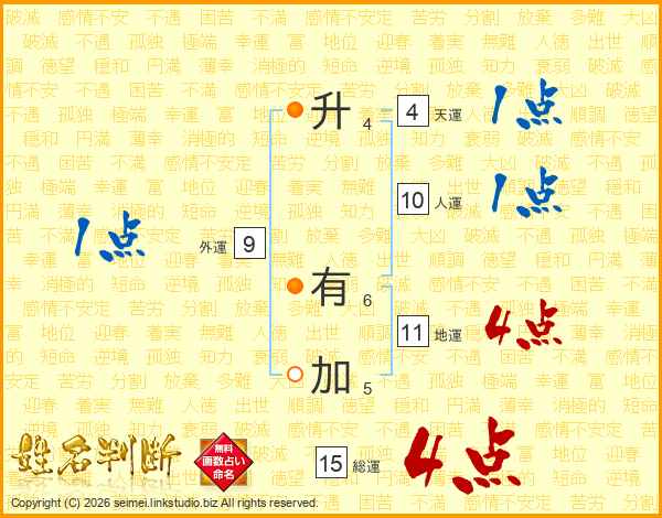 升有加さんの総運は15画の4点!
