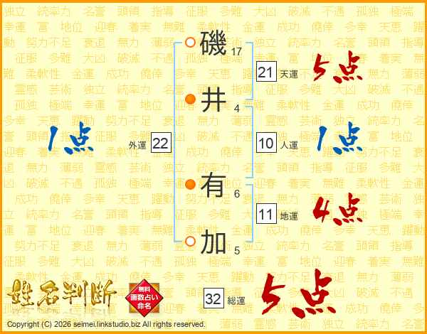 生活面を象徴する運勢です。外部から受ける影響力を表し、結婚運、家庭運や職場、環境への順応性を表します。総運から人運を引いた画数。姓や名が1文字の場合を除く。