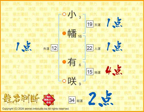小(3画)幡(16画) 有(6画)咲(9画)