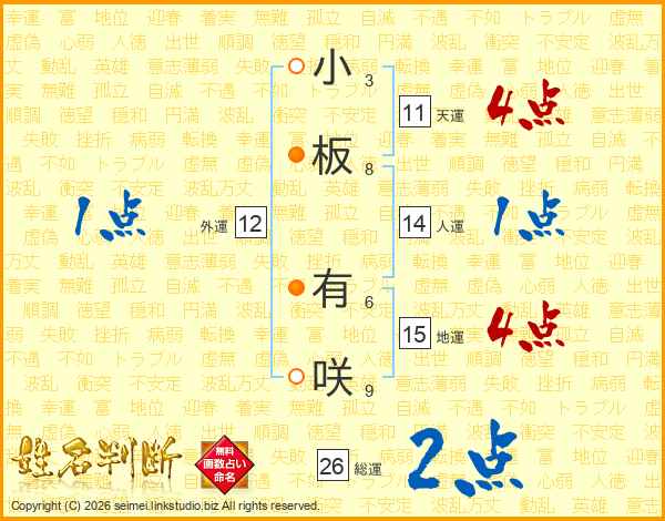 生活面を象徴する運勢です。外部から受ける影響力を表し、結婚運、家庭運や職場、環境への順応性を表します。総運から人運を引いた画数。姓や名が1文字の場合を除く。