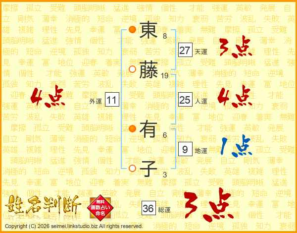 あなたの人生を表す1番重要な運勢です。生涯を通じて影響する総合運となり、主に50歳以降の晩年期に影響を及ぼします。苗字と名前の合計画数。