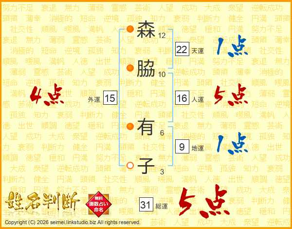 あなたの人生を表す1番重要な運勢です。生涯を通じて影響する総合運となり、主に50歳以降の晩年期に影響を及ぼします。苗字と名前の合計画数。