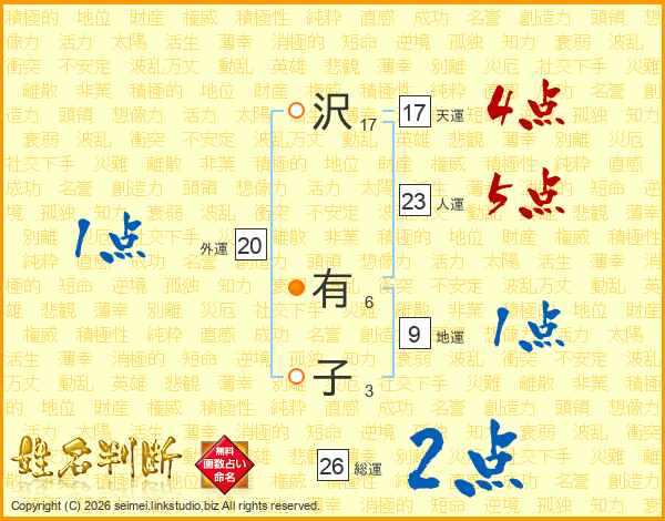 生活面を象徴する運勢です。外部から受ける影響力を表し、結婚運、家庭運や職場、環境への順応性を表します。総運から人運を引いた画数。姓や名が1文字の場合を除く。