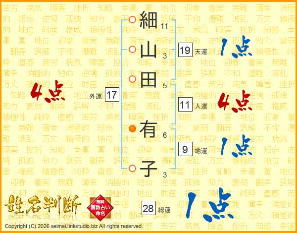 細(11画)山(3画)田(5画) 有(6画)子(3画)