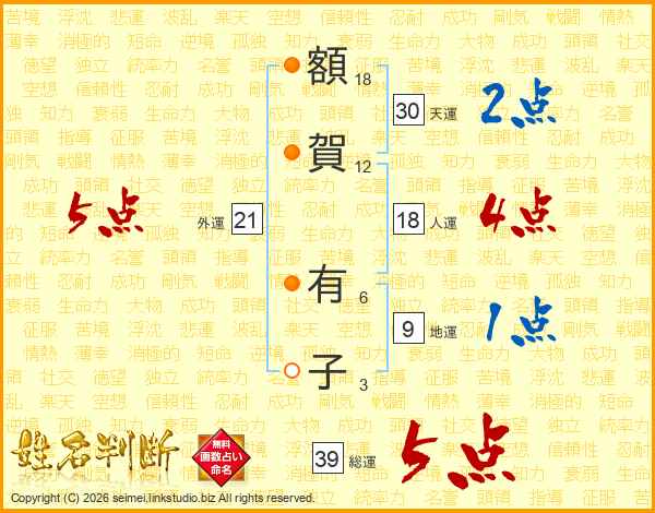 額(18画)賀(12画) 有(6画)子(3画)