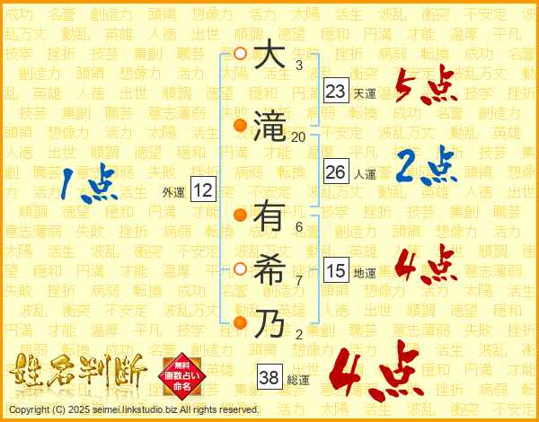 大(3画)滝(20画) 有(6画)希(7画)乃(2画)