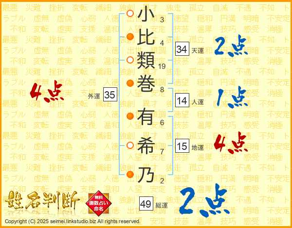 小(3画)比(4画)類(19画)巻(8画) 有(6画)希(7画)乃(2画)