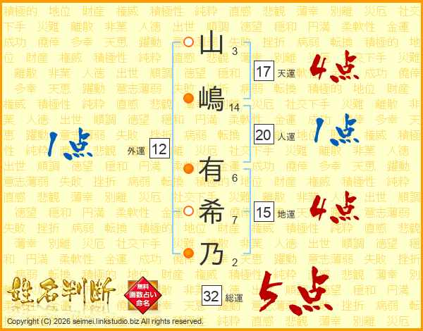 山(3画)嶋(14画) 有(6画)希(7画)乃(2画)