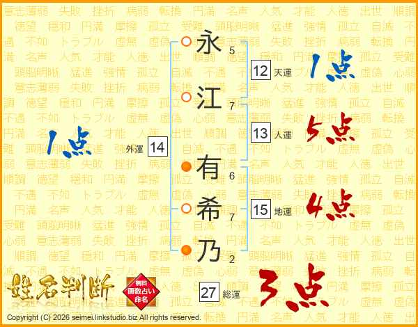 永(5画)江(7画) 有(6画)希(7画)乃(2画)