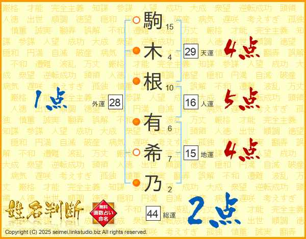 駒(15画)木(4画)根(10画) 有(6画)希(7画)乃(2画)