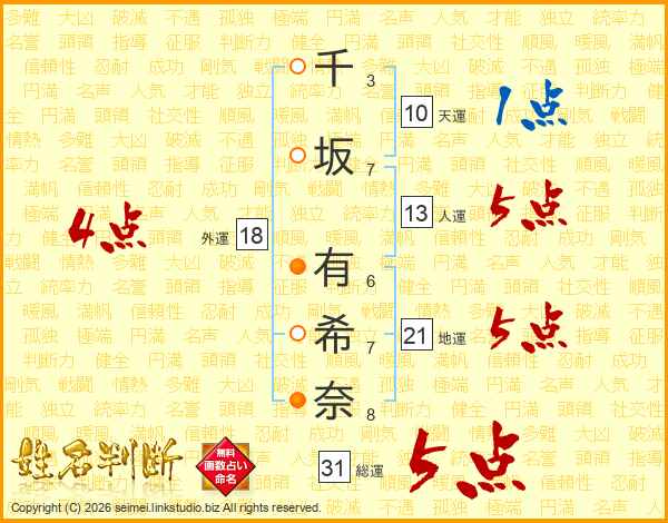 千(3画)坂(7画) 有(6画)希(7画)奈(8画)