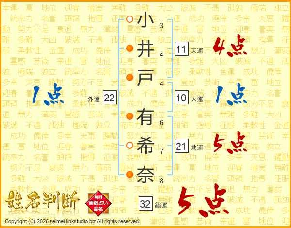 小(3画)井(4画)戸(4画) 有(6画)希(7画)奈(8画)