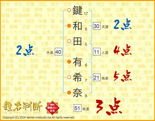鍵(17画)和(8画)田(5画) 有(6画)希(7画)奈(8画)