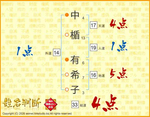 中(4画)楯(13画) 有(6画)希(7画)子(3画)
