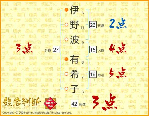 伊(6画)野(11画)波(9画) 有(6画)希(7画)子(3画)