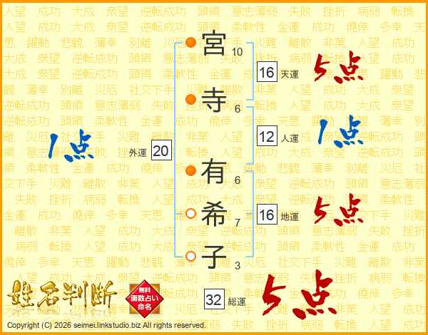 宮(10画)寺(6画) 有(6画)希(7画)子(3画)