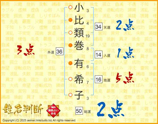小(3画)比(4画)類(19画)巻(8画) 有(6画)希(7画)子(3画)