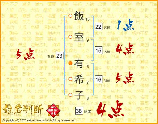 飯(13画)室(9画) 有(6画)希(7画)子(3画)