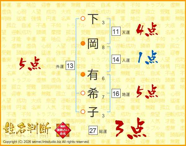 下(3画)岡(8画) 有(6画)希(7画)子(3画)
