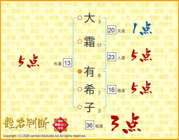 大(3画)霜(17画) 有(6画)希(7画)子(3画)