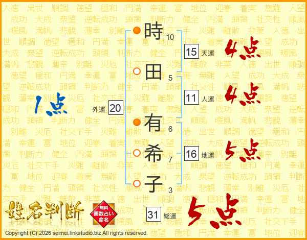 時(10画)田(5画) 有(6画)希(7画)子(3画)