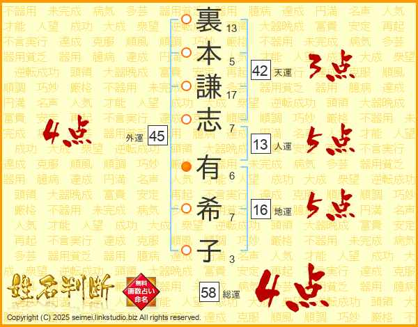 裏(13画)本(5画)謙(17画)志(7画) 有(6画)希(7画)子(3画)