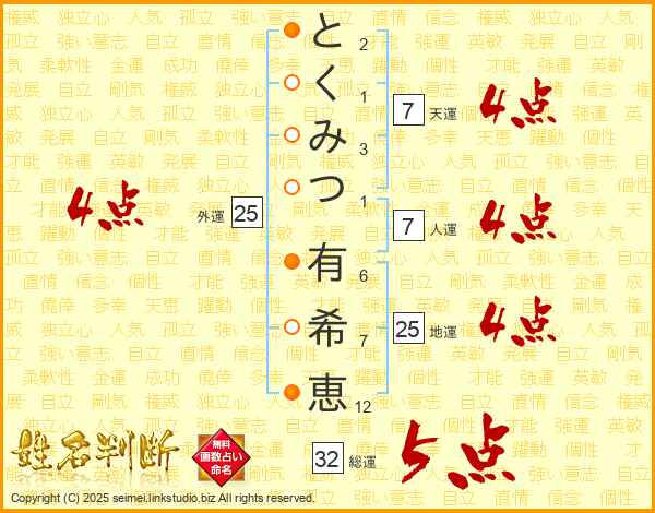 と(2画)く(1画)み(3画)つ(1画) 有(6画)希(7画)恵(12画)