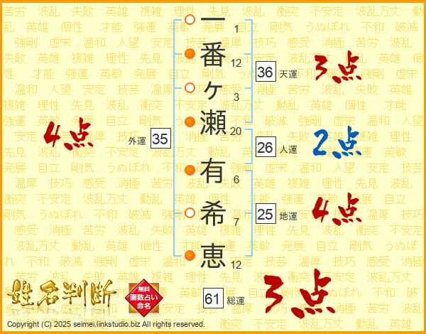 一番ヶ瀬有希恵さんの外運は35画の4点!