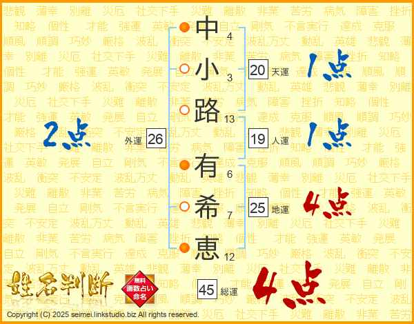 中(4画)小(3画)路(13画) 有(6画)希(7画)恵(12画)