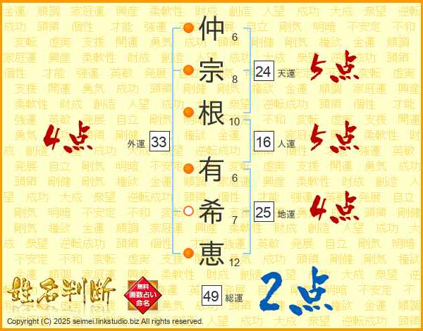 仲(6画)宗(8画)根(10画) 有(6画)希(7画)恵(12画)