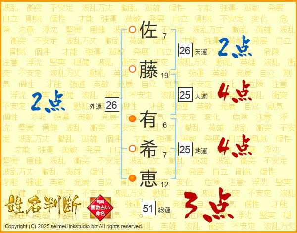 佐藤有希恵さんの人運は25画の4点!