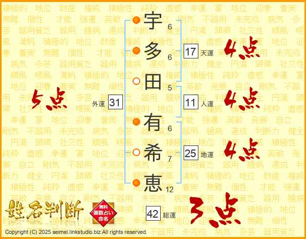 宇(6画)多(6画)田(5画) 有(6画)希(7画)恵(12画)