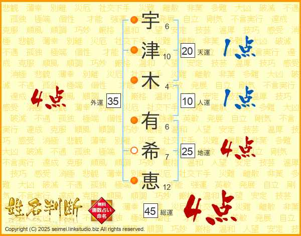 宇(6画)津(10画)木(4画) 有(6画)希(7画)恵(12画)
