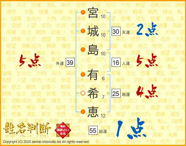 宮(10画)城(10画)島(10画) 有(6画)希(7画)恵(12画)