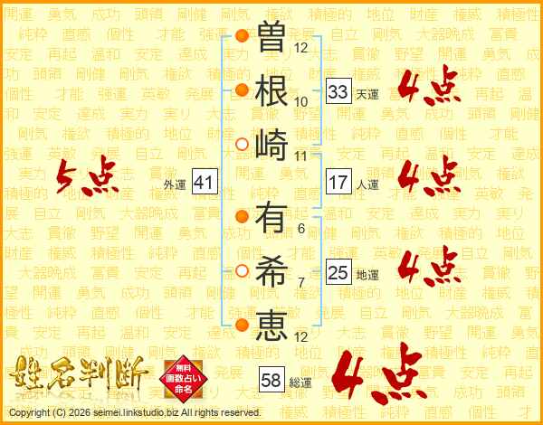 曽(12画)根(10画)崎(11画) 有(6画)希(7画)恵(12画)