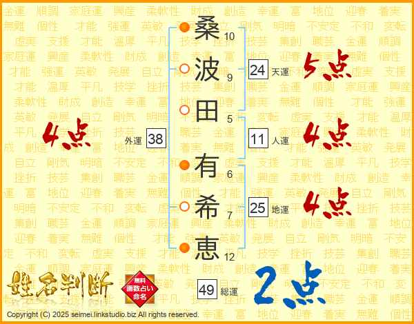 桑(10画)波(9画)田(5画) 有(6画)希(7画)恵(12画)