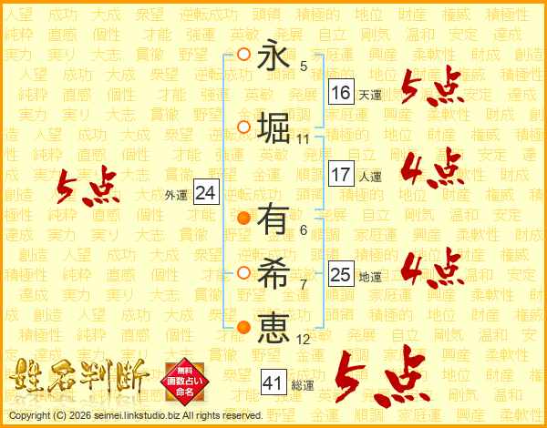永(5画)堀(11画) 有(6画)希(7画)恵(12画)