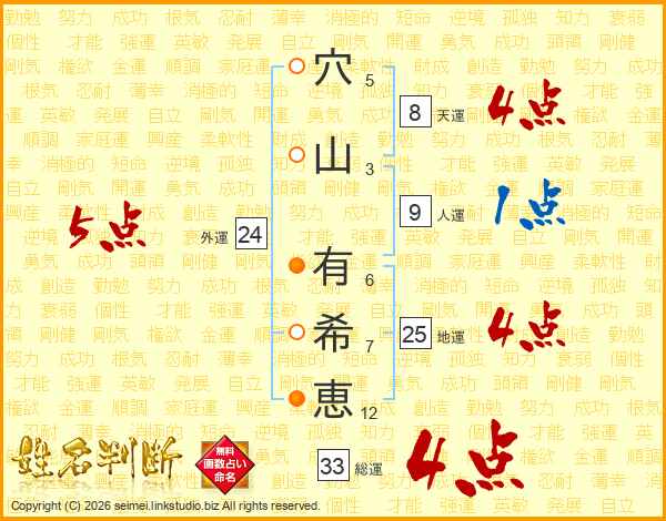穴(5画)山(3画) 有(6画)希(7画)恵(12画)