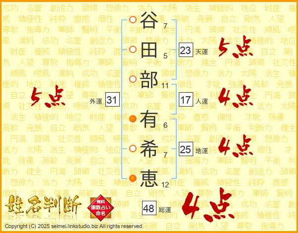 谷(7画)田(5画)部(11画) 有(6画)希(7画)恵(12画)