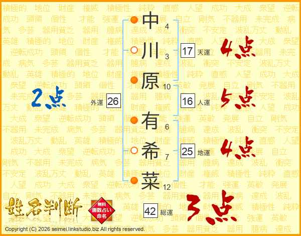 中川原有希菜さんの天運は17画の4点!