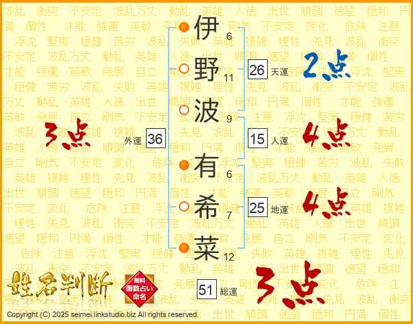 伊野波有希菜さんの天運は26画の2点!