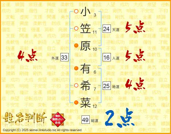 小笠原有希菜さんの総運は49画の2点!