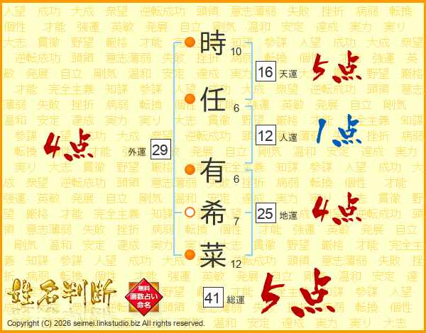 時(10画)任(6画) 有(6画)希(7画)菜(12画)