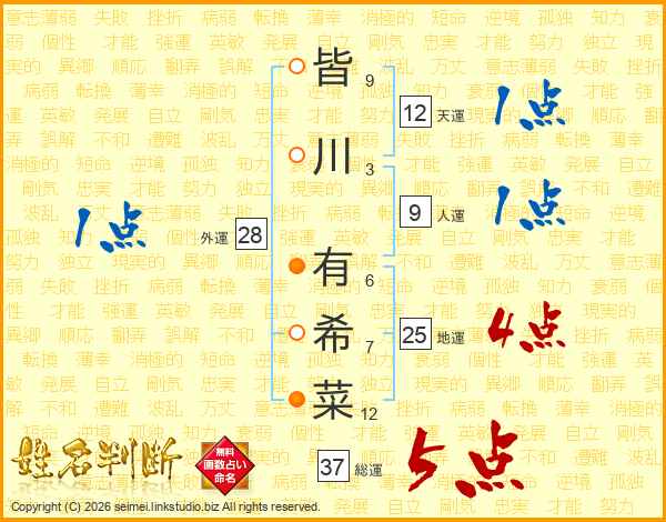 皆(9画)川(3画) 有(6画)希(7画)菜(12画)