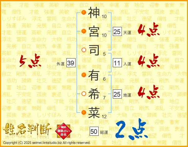 神(10画)宮(10画)司(5画) 有(6画)希(7画)菜(12画)