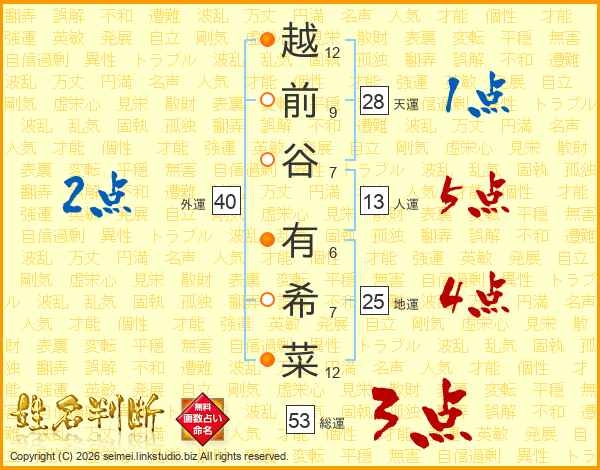 越(12画)前(9画)谷(7画) 有(6画)希(7画)菜(12画)