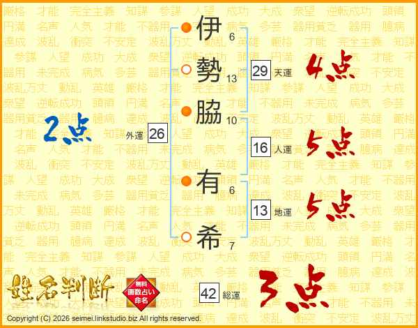 伊(6画)勢(13画)脇(10画) 有(6画)希(7画)
