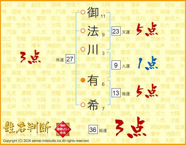 御(11画)法(9画)川(3画) 有(6画)希(7画)