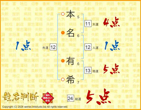 あなたの人生を表す1番重要な運勢です。生涯を通じて影響する総合運となり、主に50歳以降の晩年期に影響を及ぼします。苗字と名前の合計画数。